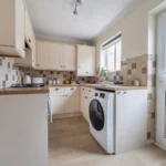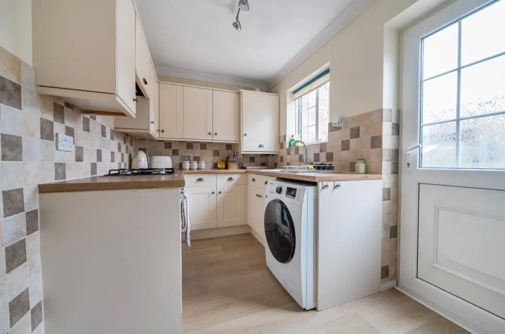 Inside, the ground floor offers a comfortable lounge with flexible living space, leading through to a practical kitchen overlooking the rear garden. The kitchen provides good storage and workspace, with room for appliances.