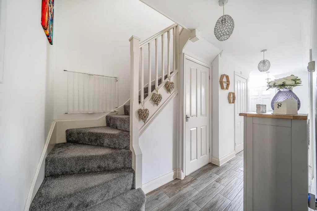 It’s set over three floors, and the layout just works. The ground floor is all about being together. A bright kitchen dining space sits at the heart of the home, with plenty of room for cooking, eating and catching up, and it opens through into a family area so you’re never cut off from what’s going on. There’s also a downstairs cloakroom, which makes a big difference in everyday life.