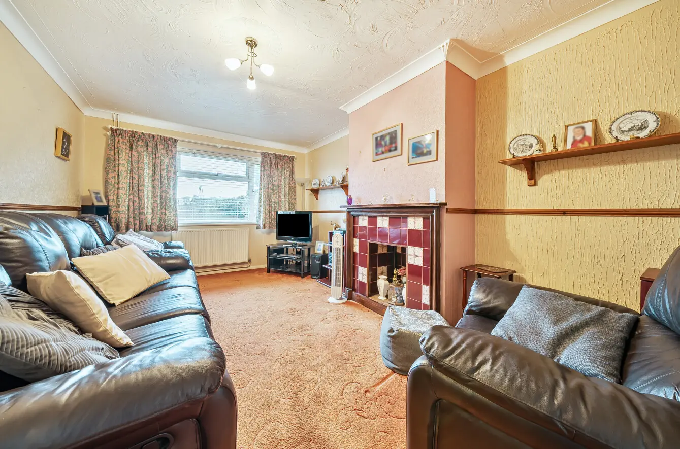 The living room is a cosy space with carpeted flooring and a focal tiled fireplace surround, with a front-facing window providing additional light.