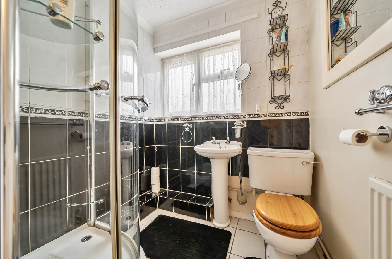 The bathroom comprises a corner step-in shower, low-level WC, hand wash basin, tiled flooring, and partially tiled walls.