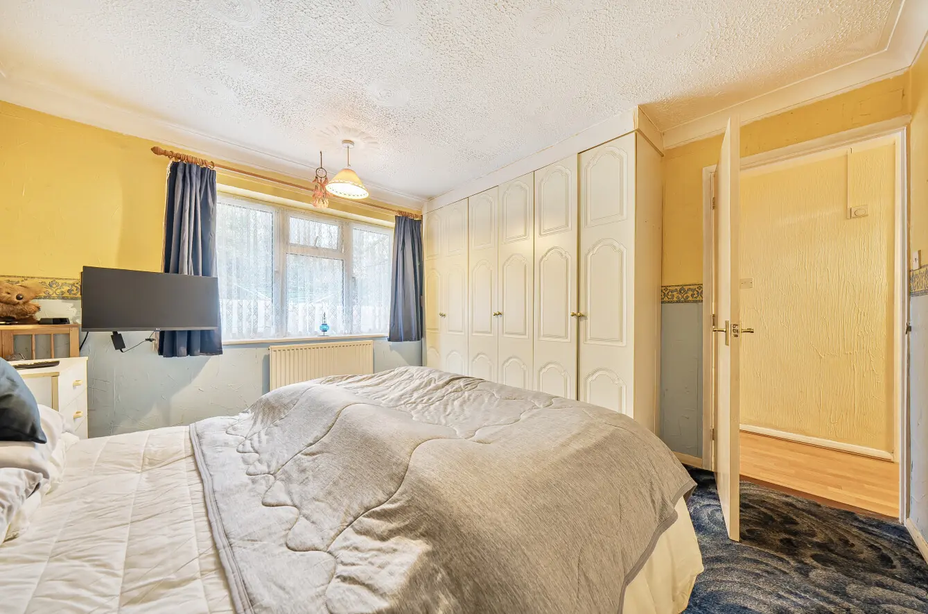 The principal bedroom includes carpeted flooring, built-in wardrobes, and two further storage cupboards, one housing the boiler. The second bedroom is a comfortable single with a rear-facing window.