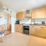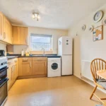 The kitchen/dining room is fitted with a range of wall and base units with brushed chrome fittings, tiled flooring, and space for a gas oven with extractor fan, tall fridge/freezer, and washing machine. A window to the front aspect fills the room with natural light.