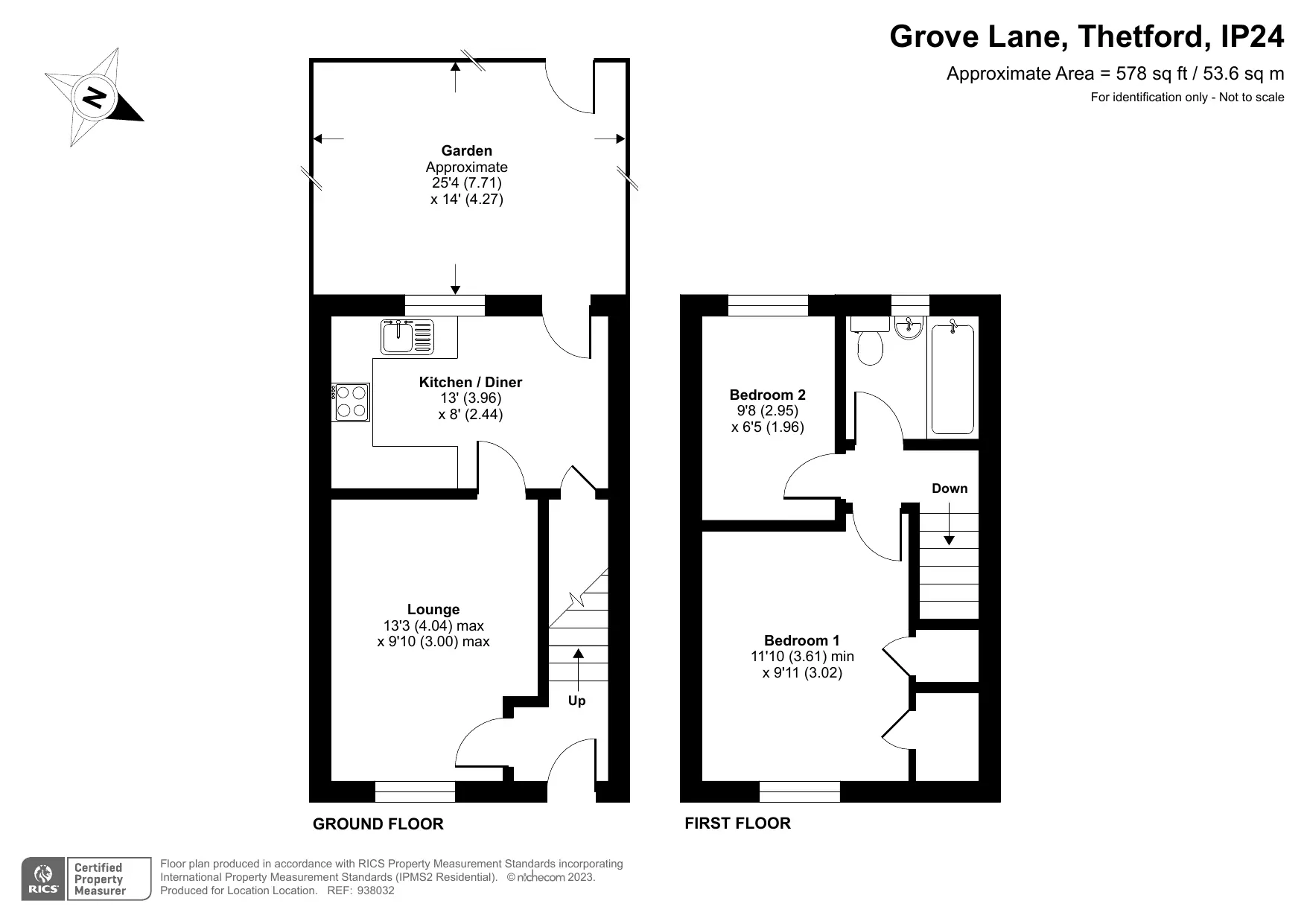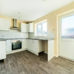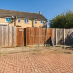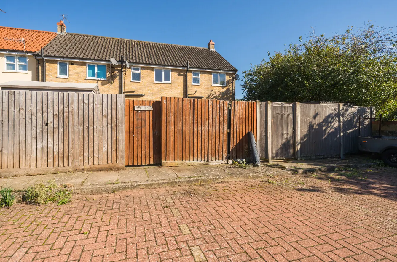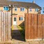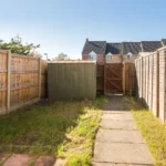 A door leads directly into the rear garden from the kitchen, which has a small paved patio area and a lawn, with a pathway to the rear gate giving access to the allocated parking.