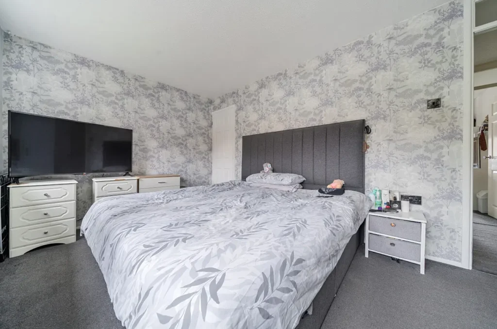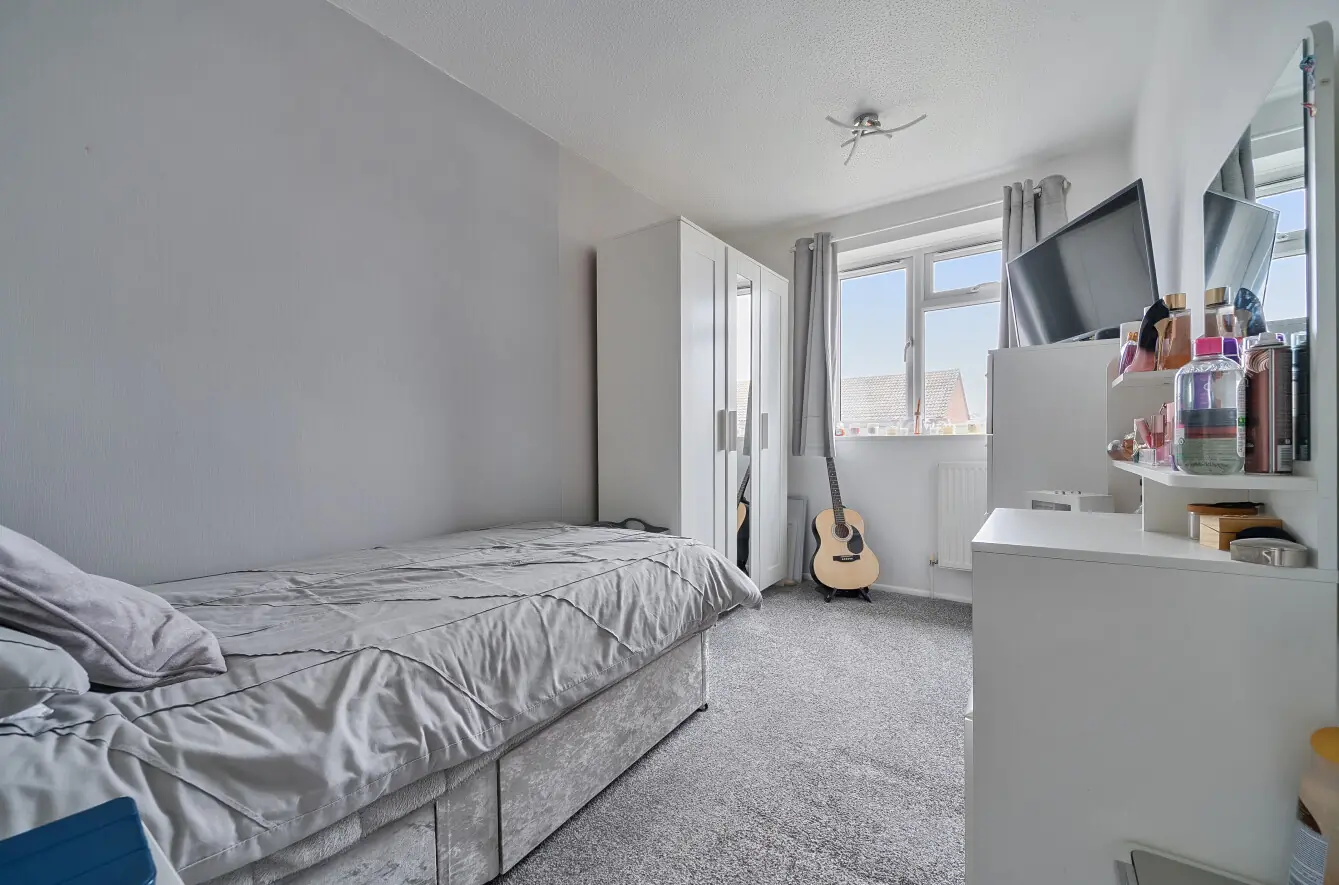 The principal bedroom is a generous double with dual aspect windows to the front, offering space for a king-size bed and flexible furniture arrangements, along with a useful storage cupboard over the stairs. Bedroom two is a good-sized single bedroom with a window overlooking the rear garden. Bedroom three is a further single bedroom, also enjoying a rear-facing window.