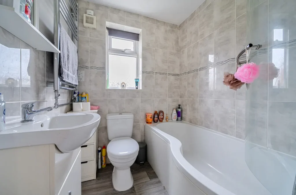 The bathroom is mainly tiled and comprises a low-level WC with dual flush, a hand wash basin set within a vanity unit with storage, a P-shaped bath with overhead shower attachment, a heated towel rail, an extractor fan, shaver point, spot lighting, and wood effect vinyl flooring.