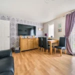 Entering via the side entrance, you are welcomed into the entrance hall, which provides access to the stairs to the first floor, the living room, kitchen, and bathroom. The entrance hall features grey wood-effect vinyl flooring, which continues into the bathroom.
