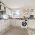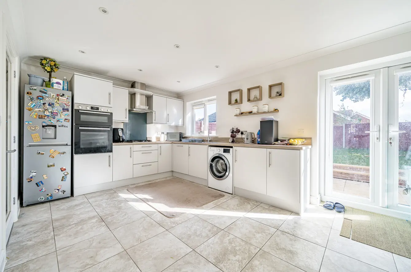 The kitchen/diner is a fantastic social space, finished with tiled flooring and spot lighting. It includes an electric oven and grill with gas hob, an integrated dishwasher, and space for both a fridge/freezer and a washing machine. There is ample room for a dining table to seat six, and double patio doors open directly into the rear garden.