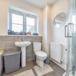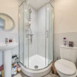 The principal bedroom is set to the front and features a double storage cupboard along with its own en suite, complete with step-in shower, WC, hand wash basin, vinyl flooring, spot lighting, and shaver point. Bedroom two is a comfortable double with a rear aspect, while bedroom three is a generous single, also with a rear aspect.