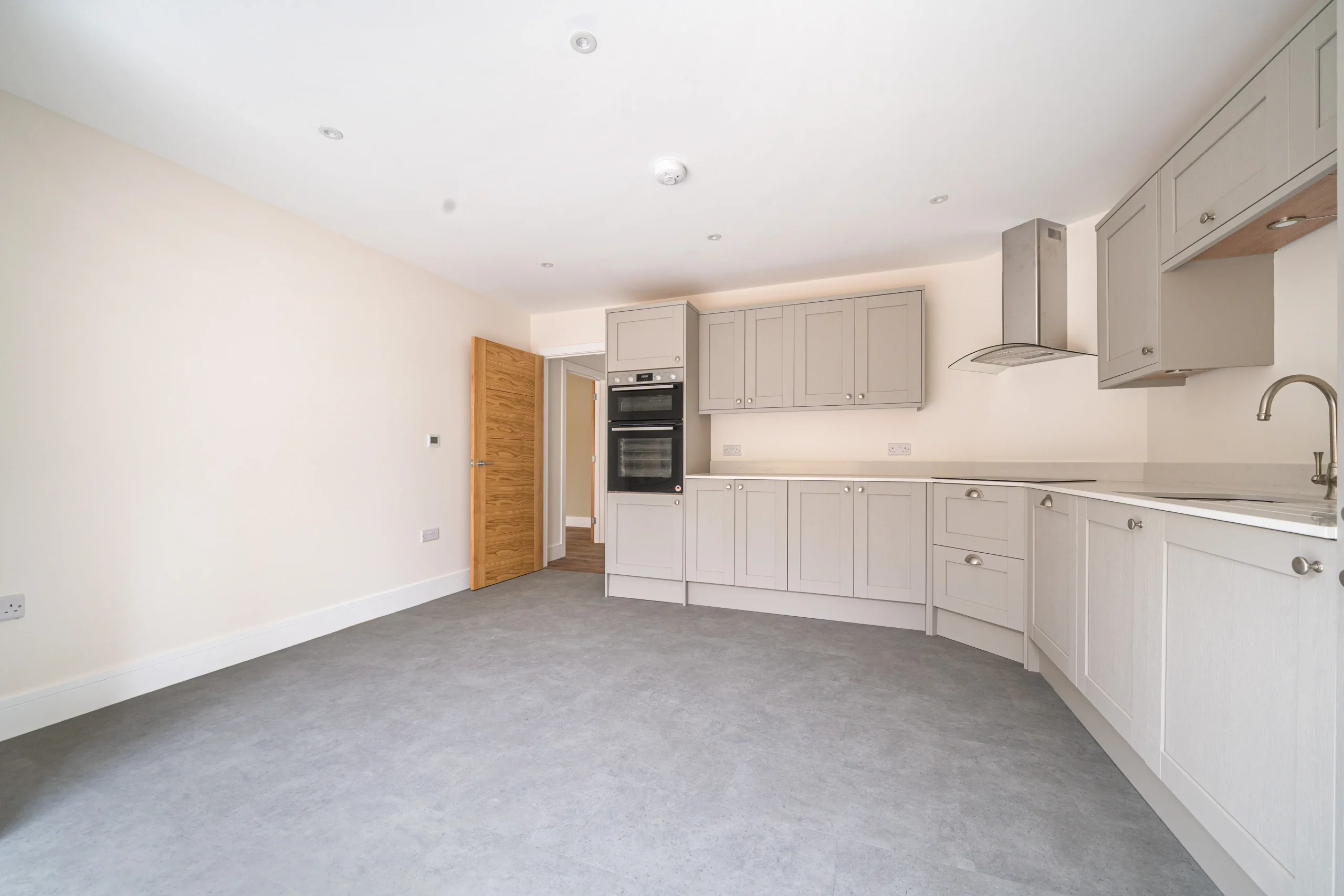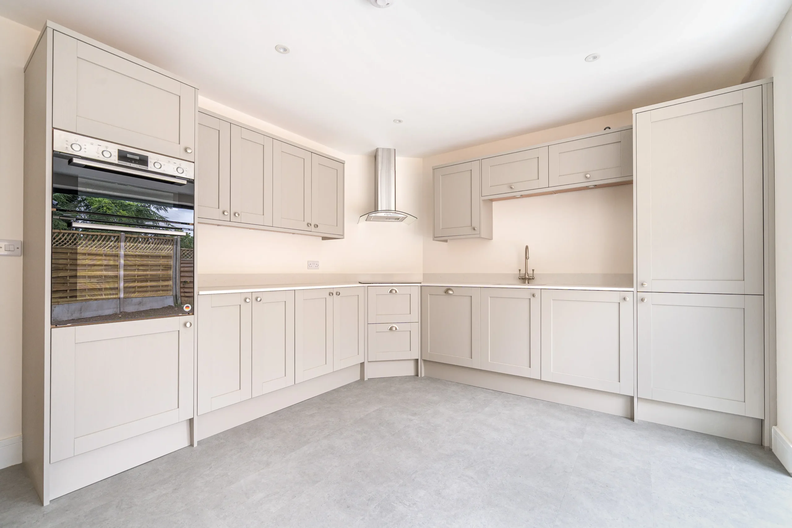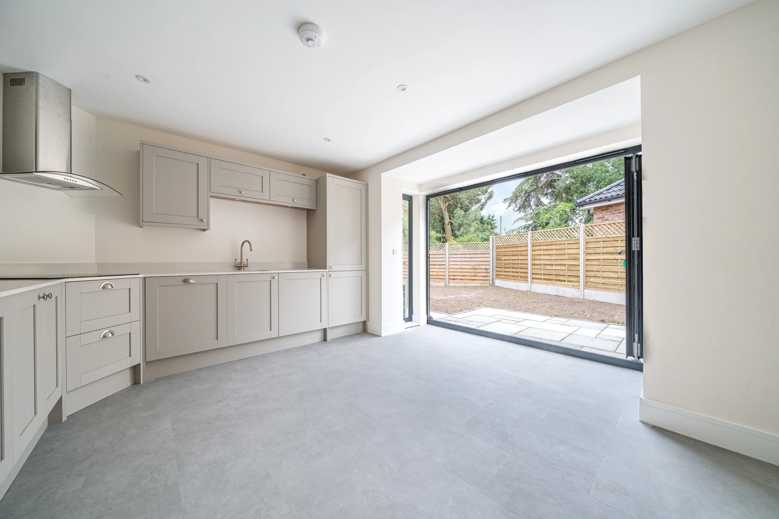 The kitchen and dining area feature tile-effect LVT flooring in soft light grey tones, complemented by sleek marble-effect work surfaces and brushed chrome fittings. Integrated appliances include a double oven and grill, a 4-ring induction hob with overhead extractor, dishwasher, fridge/freezer and washing machine. The dining area comfortably seats six and benefits from bifolding doors that lead directly onto the rear patio and garden, creating a seamless indoor-outdoor flow.