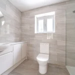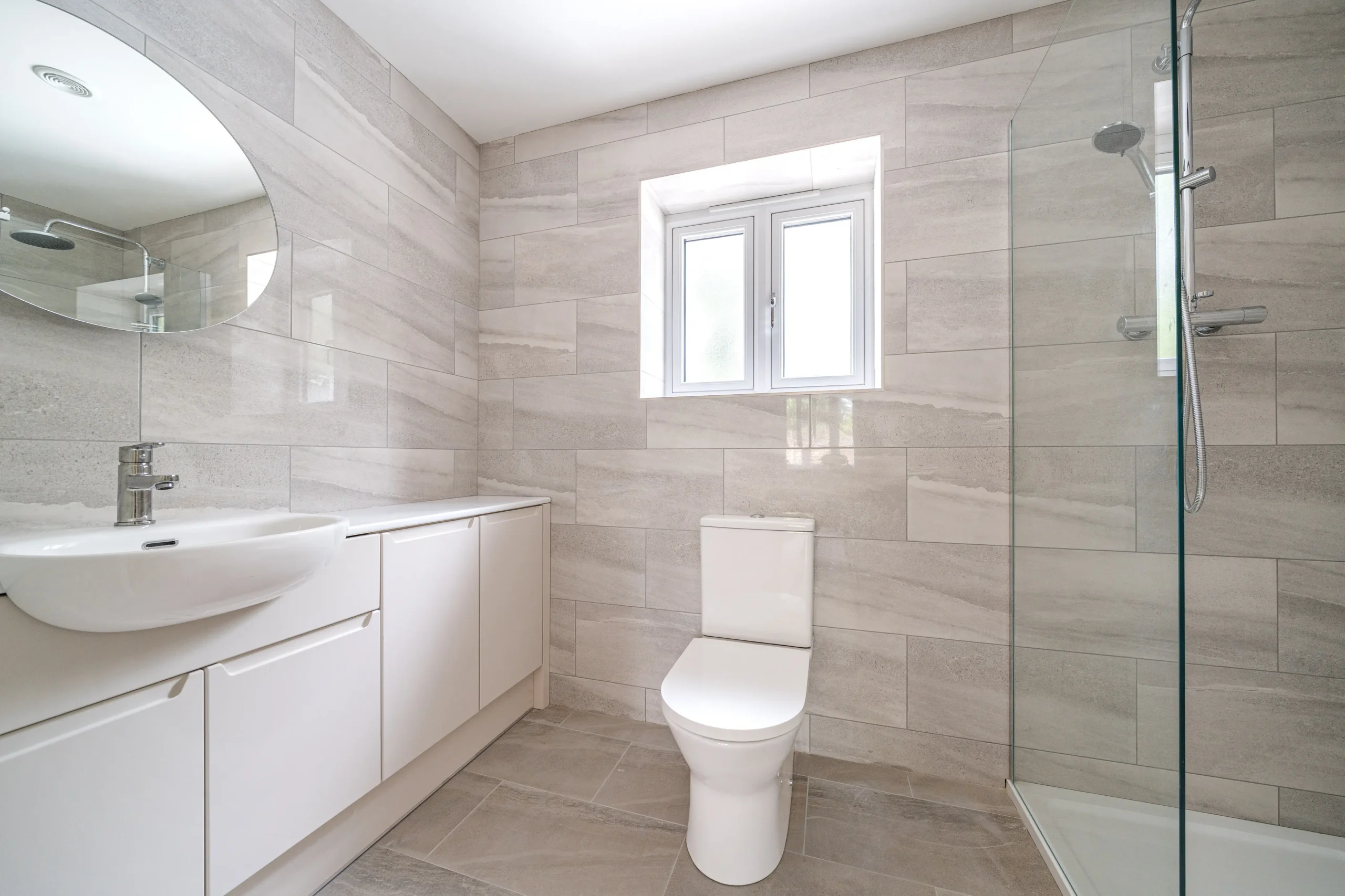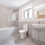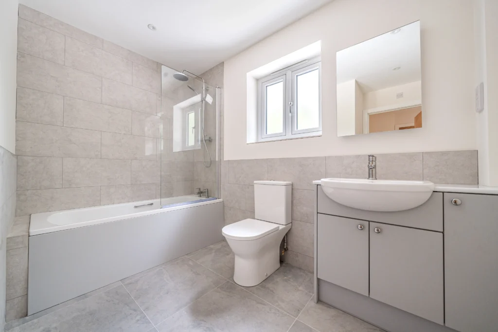 The three-piece bathroom suite is finished with a bath and mixer shower, rainwater shower head, and fully tiled walls to dado height. A vanity sink unit with storage, stainless steel fittings, and porcelain tiled flooring completes the contemporary look.