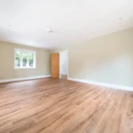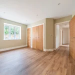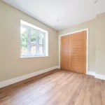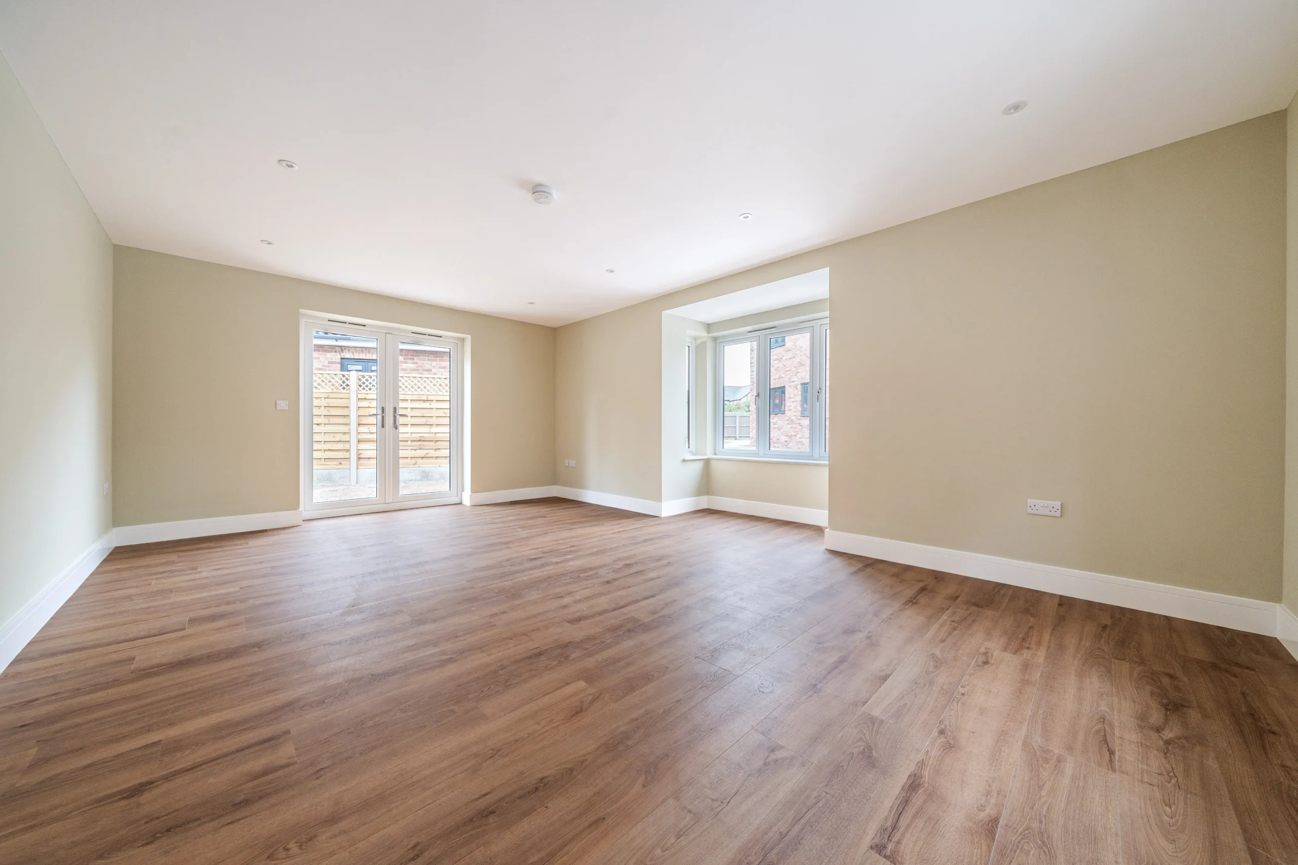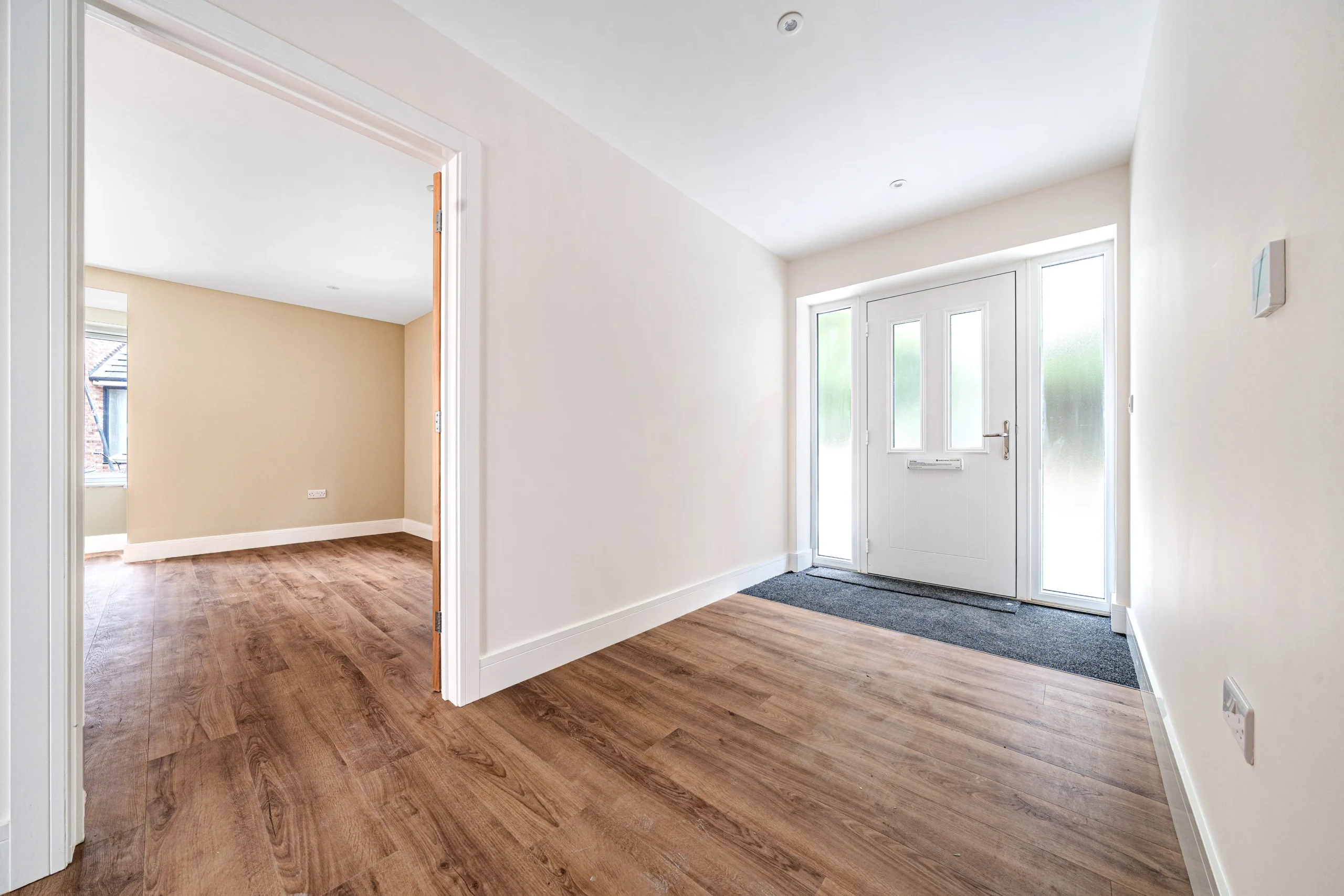 A glazed composite internal entrance door leads into a spacious and welcoming hallway, complete with a cloak and storage cupboard, loft access, and an airing cupboard. Oak veneer doors with brushed chrome fittings throughout add an elegant finishing touch, and wood grain effect LVT flooring flows seamlessly through the lounge and all three bedrooms, creating a stylish and cohesive interior. The lounge is bright and inviting, with a box bay window to the side, a front-facing double-glazed window, and French-style patio doors opening onto the rear garden, offering the perfect space for relaxing or entertaining.