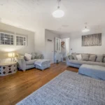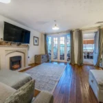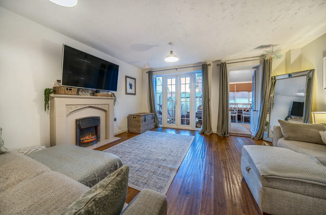 The engineered wood flooring, which is the same flooring as the hallway, continues through into the living room. This room features a living flame fire with surround, allowing for flexible furniture arrangements, and includes additional storage cleverly incorporated under the stairs. Patio doors open directly onto the rear garden. From the living room, a separate door leads into the bright conservatory, which is currently arranged as a dining room with space for a table for up to six, as well as a work-from-home office area, making it a versatile and practical space.
