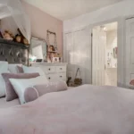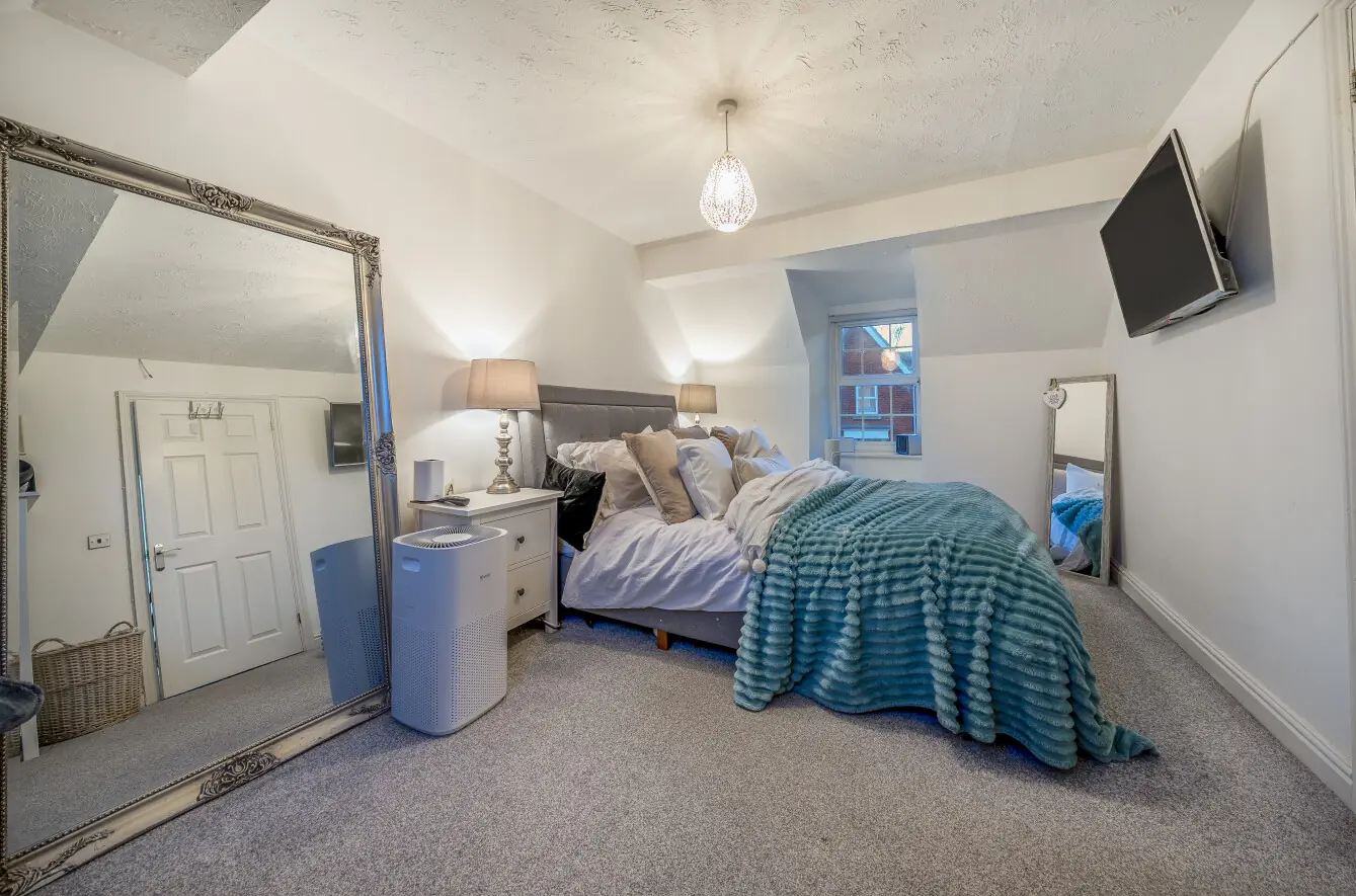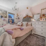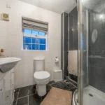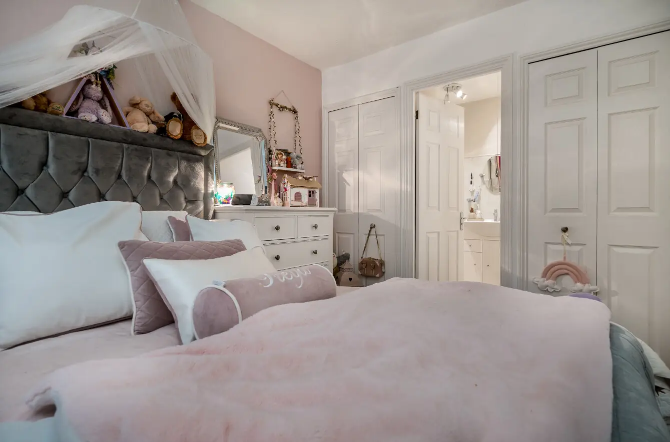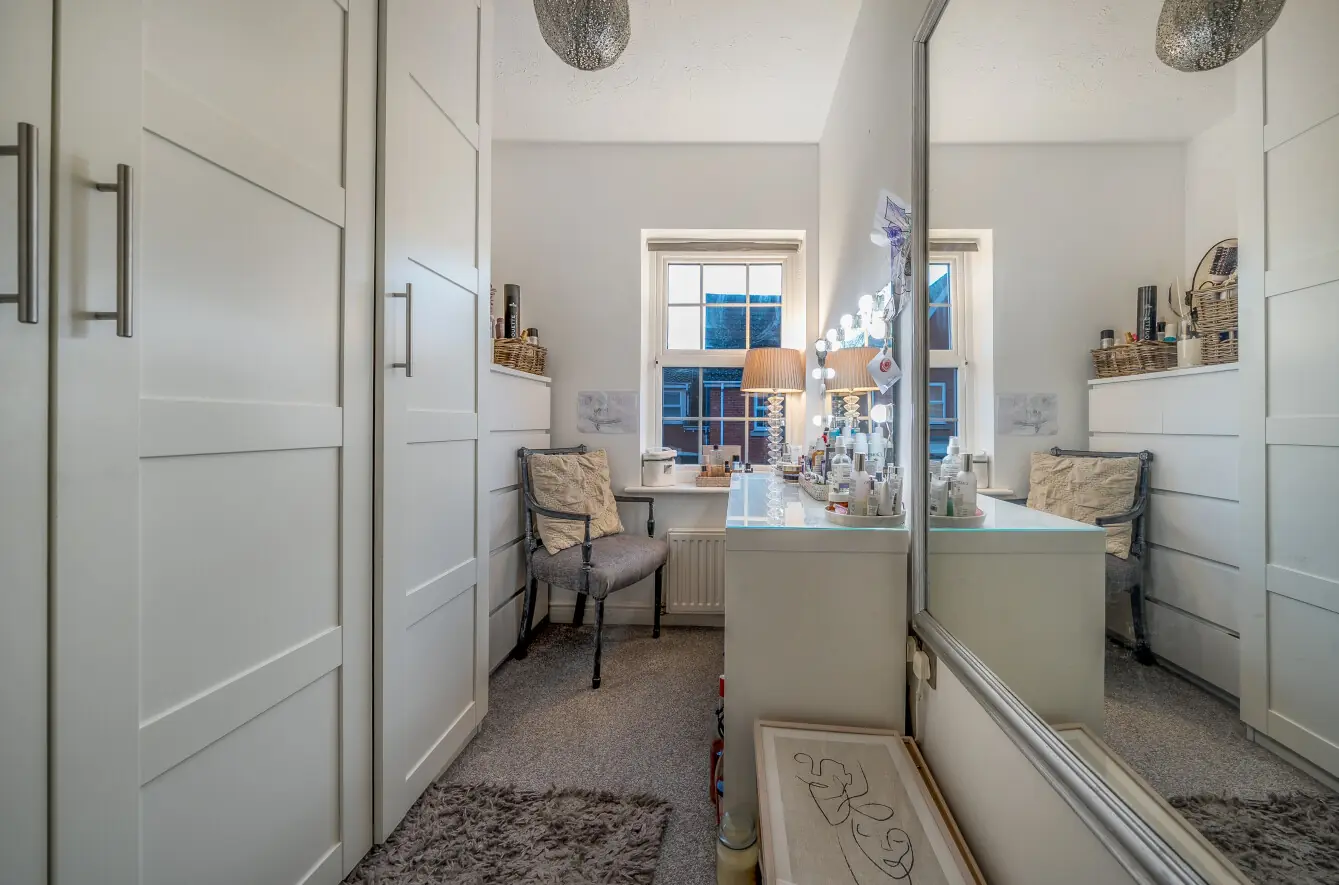 The principal bedroom is carpeted, has a window to the front, and includes two double fitted wardrobes. It also benefits from an en-suite shower room with tiled flooring, a step-in shower, a handwash basin with storage surround and a low-level WC with dual flush. Bedroom two is carpeted and features a Velux window to the rear and a dormer window to the front. Bedroom three also has carpeted flooring, a rear-facing window and double built-in wardrobes. Bedroom four has been adapted as a walk-in wardrobe, with fitted wardrobes along one wall, a front-facing window and carpeted flooring.