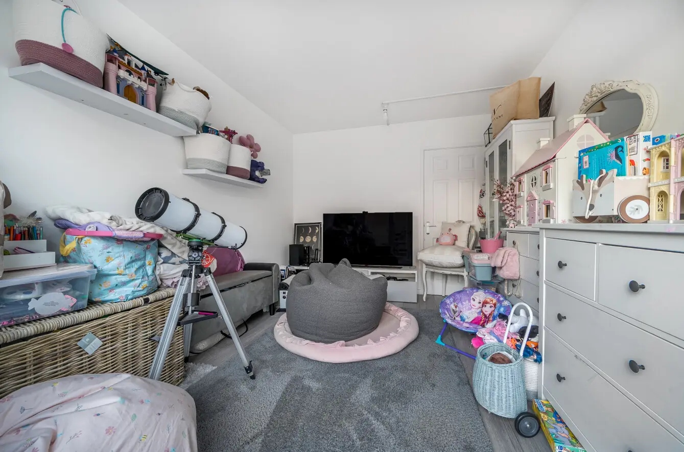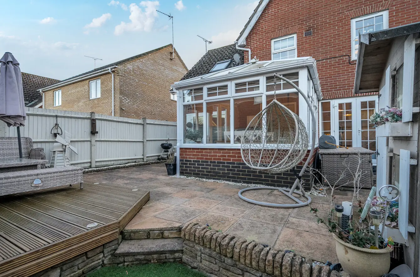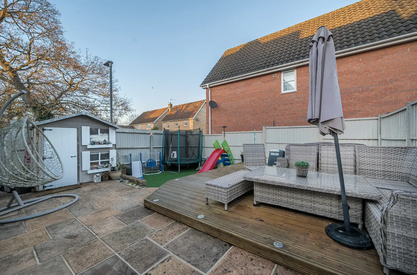The rear garden is fully enclosed and beautifully maintained, featuring a wrap around patio, a timber deck seating area, and artificial lawn, providing the perfect space for alfresco dining, relaxing or entertaining. The garden still offers plenty of space for children to play, making it ideal for families. The partially converted garage adds versatility to the space, creating a playroom or hobby area while still retaining storage to the front beyond the up and over garage door, making indoor outdoor living possible. Designed with low maintenance in mind, the garden offers excellent privacy and year-round enjoyment.