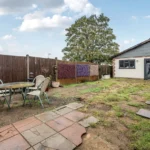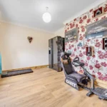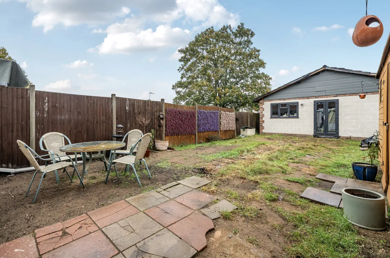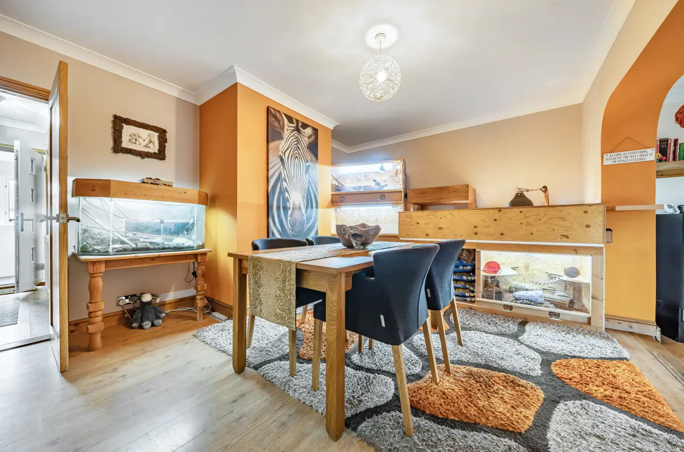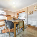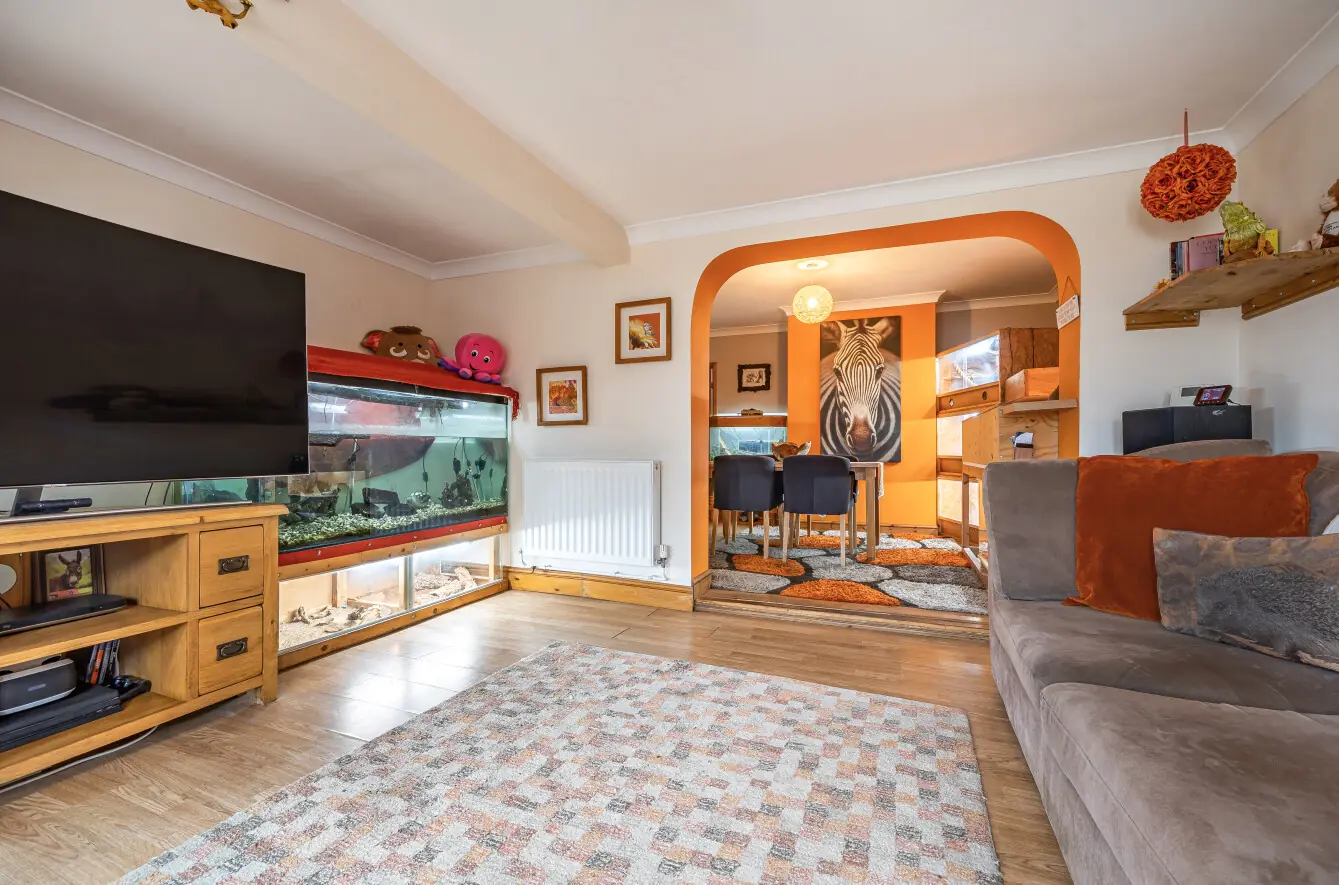 At the end of the hallway is the current dining room, which comfortably accommodates a six-seater table. An archway connects this space to the extended living room, creating a lovely open-plan flow. The living room extension is timber framed, with double patio doors opening to the rear garden and a large window allowing plenty of natural light into the room. Both the dining and living areas are finished with laminate flooring, creating a cohesive and spacious feel.