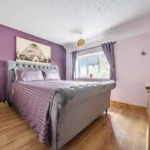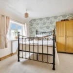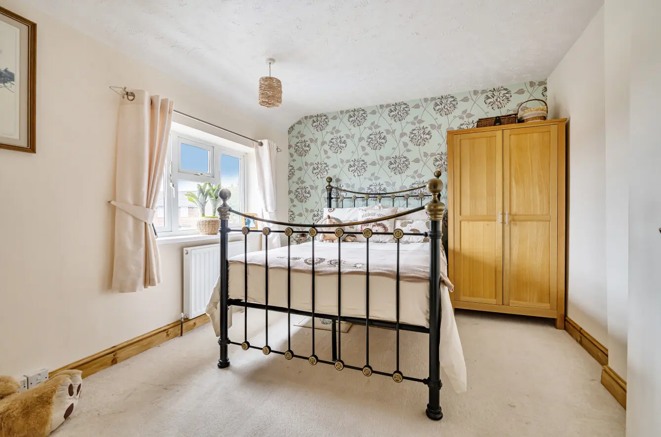 The principal bedroom has laminate flooring, a rear-facing window, and a recessed alcove. Bedroom two is a good-sized double with a window to the front and carpet flooring. The dressing room, formerly the bathroom, now offers carpet flooring, a window to the side, and built-in shelving and hanging space.
