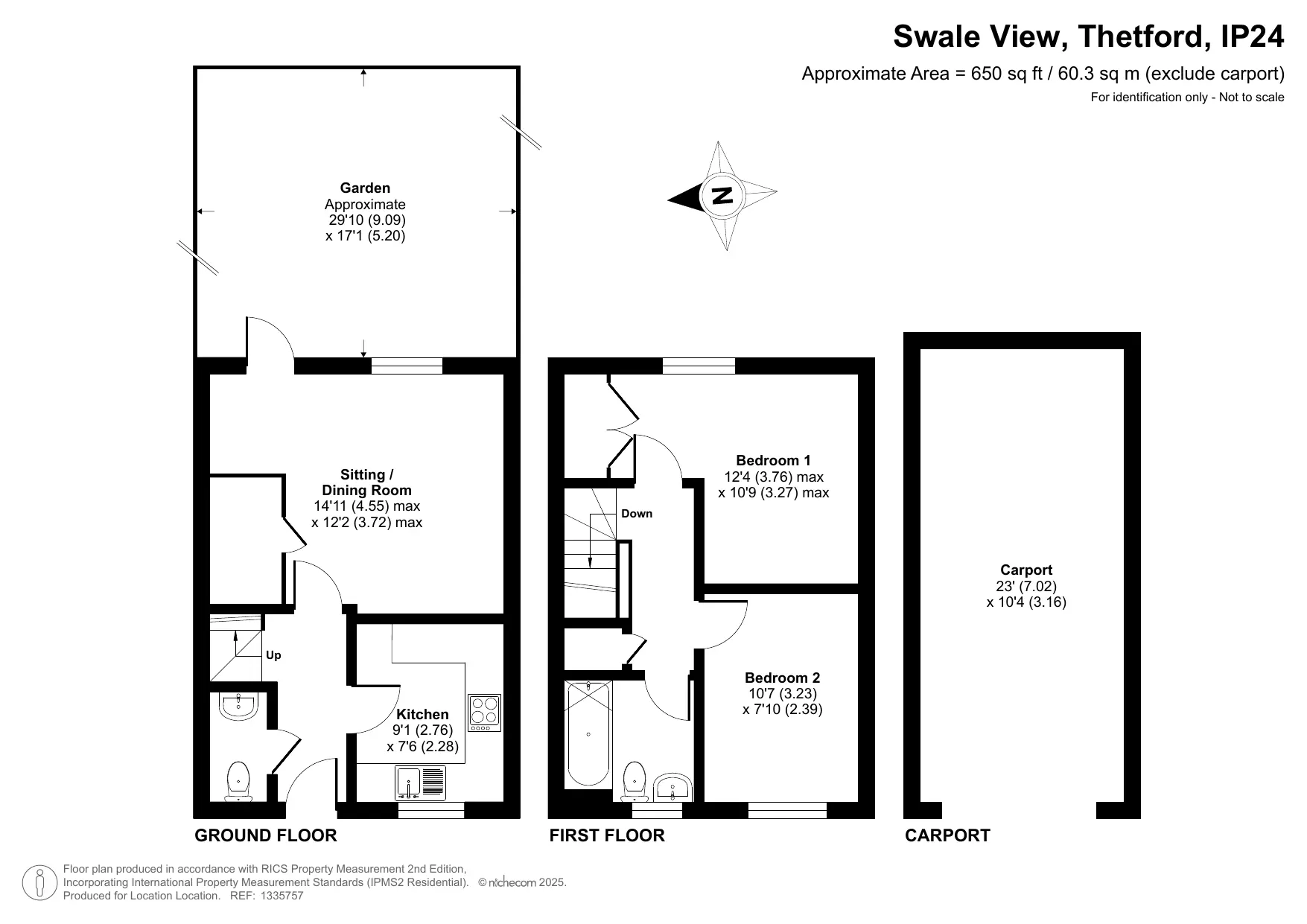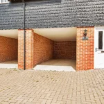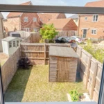 At the rear, the lounge and dining area is bright and comfortable, with ample room for a dining table (currently set for four) and a useful understairs storage cupboard. A door leads out to the rear garden, which includes a paved patio area with steps, a timber garden shed, and a side gate providing pedestrian access to the rear parking area. The garden is fully enclosed by a combination of brick wall and timber fencing. The property benefits from ownership of the central car port along with the private parking space directly in front of it.