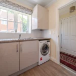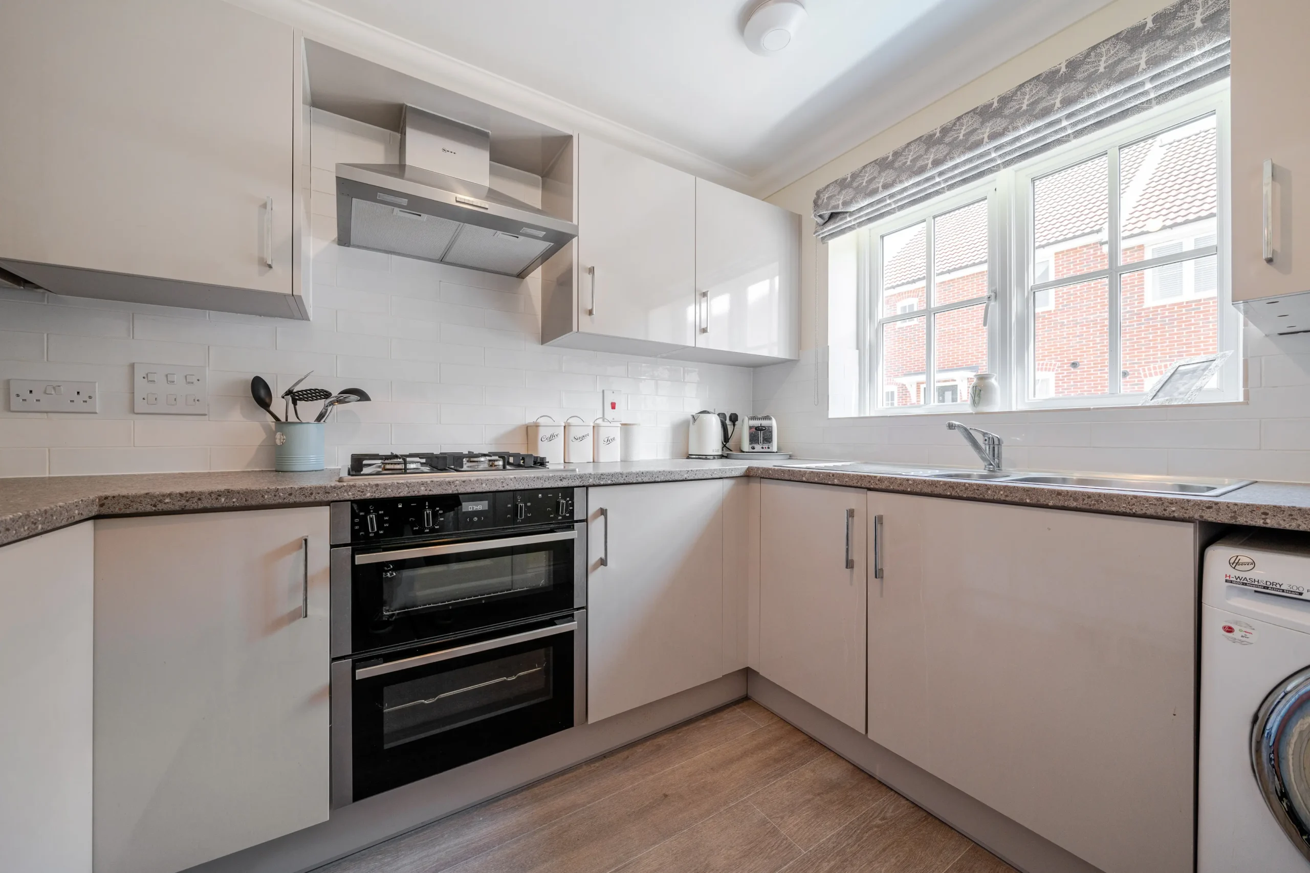 To the right, the well appointed kitchen features grey gloss units with stainless steel fitments, a one and a half bowl stainless steel sink and drainer beneath a front facing window, built in oven and grill, four ring gas hob with extractor fan above, metro style tiled splashbacks, space for a freestanding fridge freezer, and plumbing for a washing machine.