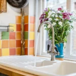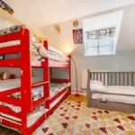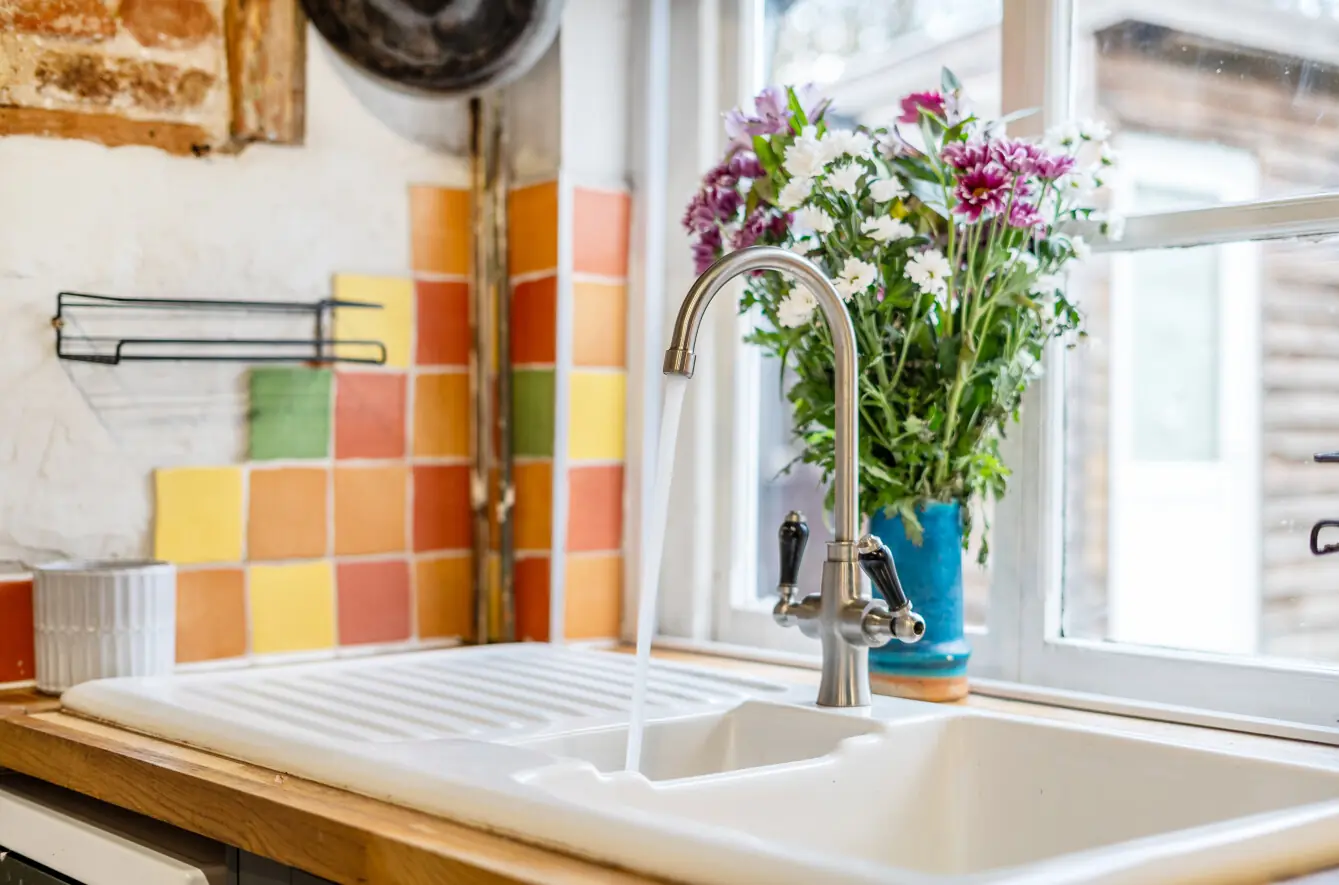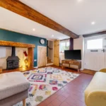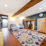 Adjacent is the dining room or playroom, which has recently been re-lime plastered, offering a bright, flexible space for dining or relaxation. The inner hallway continues with the same tiled flooring and provides access to the kitchen, bathroom, and rear garden via a stable-style door, with space for coats and shoes.