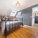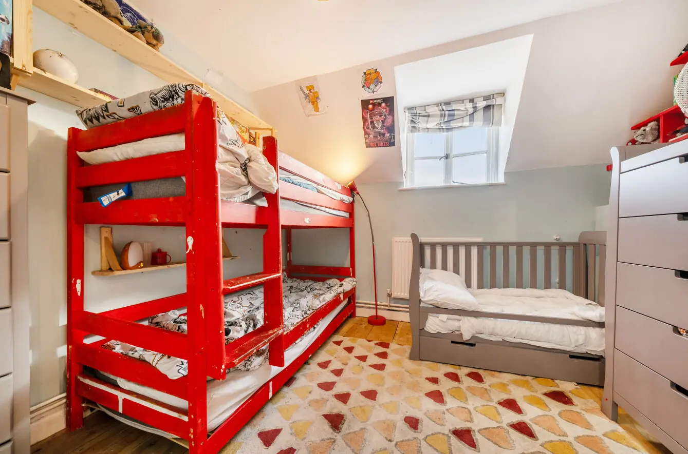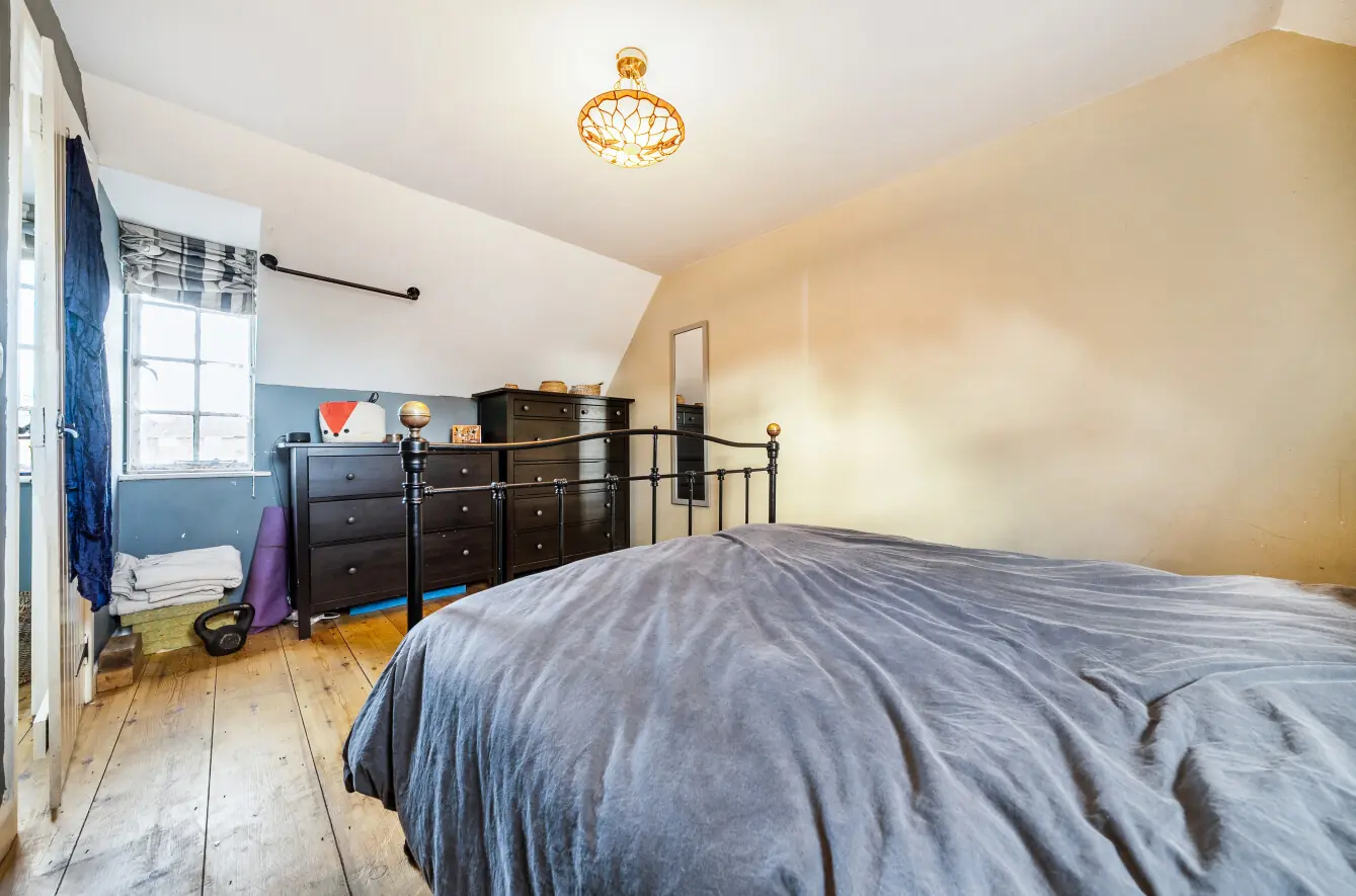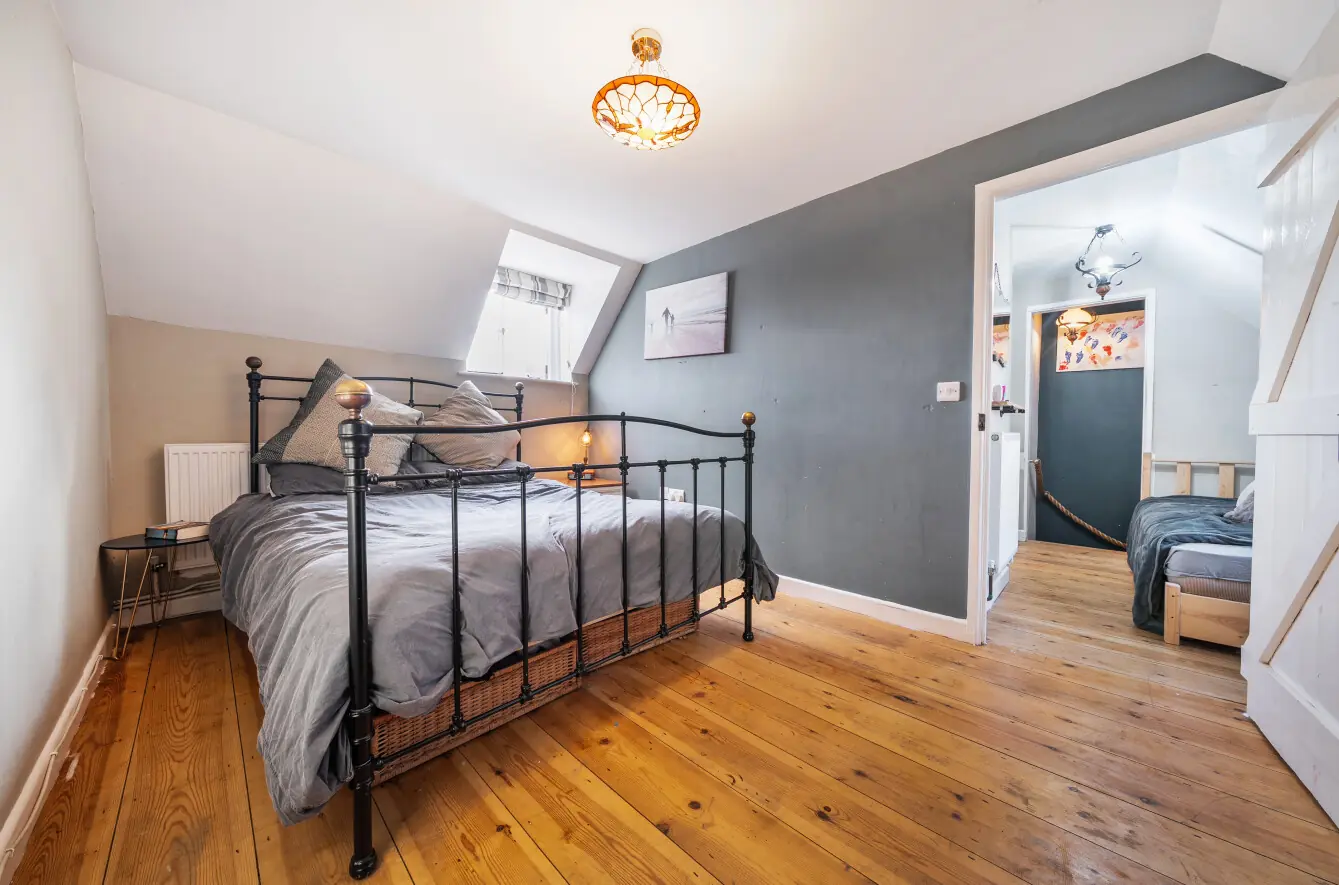 On the first-floor landing, there is a versatile space ideal as a study nook with a front-facing window. The principal bedroom is a generous double with stripped wooden flooring and dual-aspect windows to the front and rear. The second bedroom is a spacious single with stripped wooden flooring and access to the loft via a hatch.