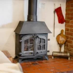 To the front, a small garden area with a picket fence and pathway leads to a traditional cottage-style entrance door, opening directly into the lounge. The lounge features exposed ceiling timbers, tiled flooring, brick-beamed ingle nook fireplace with inset woodburner, and stairs leading to the first floor. The property benefits from oil-fired central heating throughout.