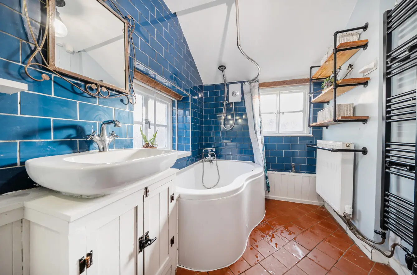The bathroom is dual aspect with secondary double glazing, tiled flooring, a low-level WC with dual flush, vanity sink unit, corner bath with shower attachment, radiator, and heated towel rail.